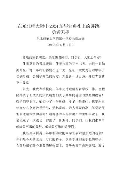 / 领导讲话:20240601在东北师大附中2024届毕业典礼上的讲话:勇者无畏——东北师范大学附属中学校长