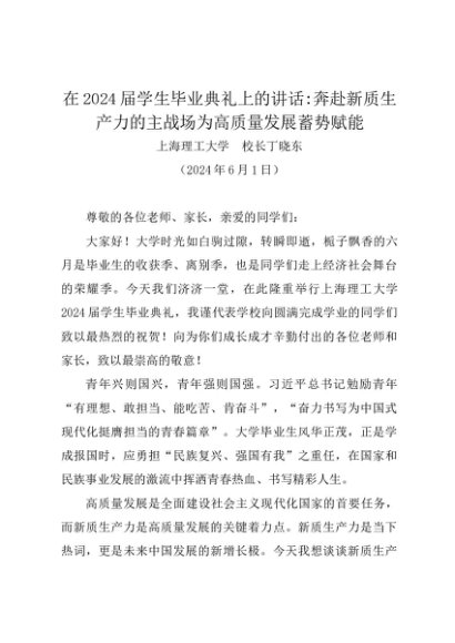 领导讲话:20240601在2024届学生毕业典礼上的讲话 奔赴新质生产力的主战场为高质量发展蓄势赋能——上海理工大学 校长