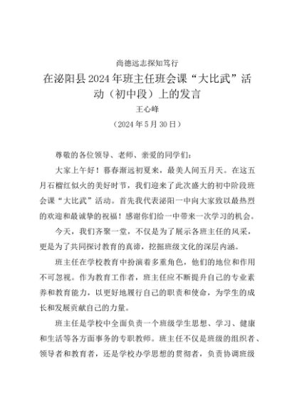 / 领导讲话:20240530在泌阳县2024年班主任班会课“大比武”活动(初中段)上的发言