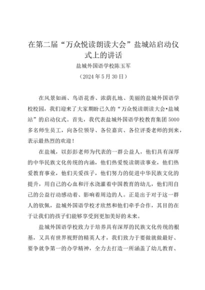 / 领导讲话:20240530在第二届“万众悦读朗读大会”盐城站启动仪式上的讲话——盐城外国语学校陈玉军