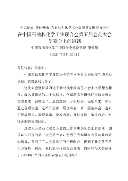 / 领导讲话:20240530在中国石油和化学工业联合会第五届会员大会闭幕会上的讲话——中国石油和化学工业联合会党委书记
