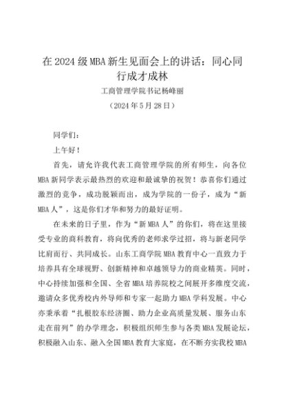 / 领导讲话:20240528在2024级MBA新生见面会上的讲话:同心同行成才成林——工商管理学院书记