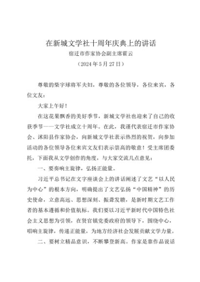 / 领导讲话:20240527在新城文学社十周年庆典上的讲话——宿迁市作家协会副主席