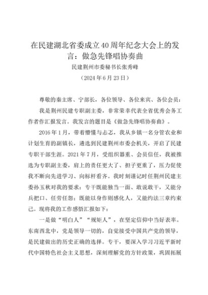 领导讲话:20240523在民建湖北省委成立40周年纪念大会上的发言:做急先锋唱协奏曲——民建荆州市委秘书长张秀峰