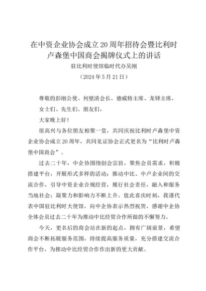 领导讲话:20240521在中资企业协会成立20周年招待会暨比利时卢森堡中国商会揭牌仪式上的讲话——驻比利时使馆临时代办吴刚