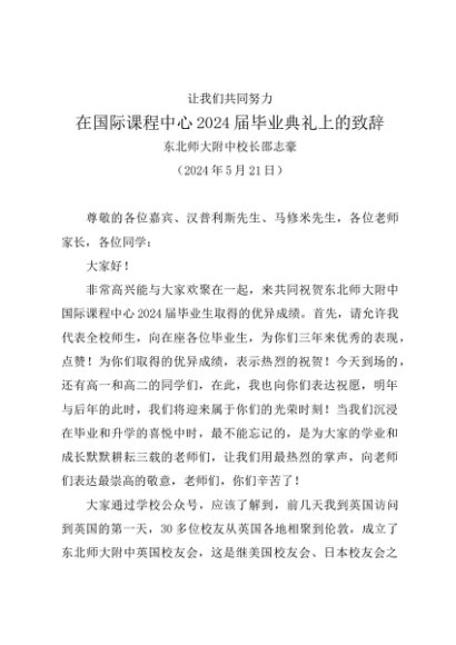 / 领导讲话:20240521在国际课程中心2024届毕业典礼上的致辞——东北师大附中校长