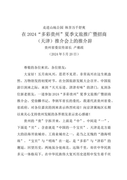 / 领导讲话:20240520在2024“多彩贵州”夏季文旅推广暨招商(天津)推介会上的推介辞——贵州省委宣传部长 卢雍政