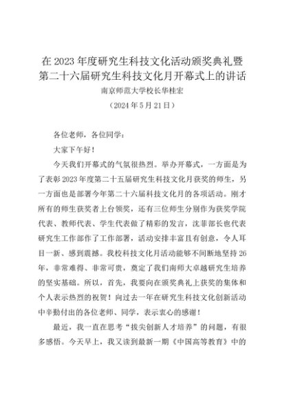 领导讲话:20240521在2023年度研究生科技文化活动颁奖典礼暨第二十六届研究生科技文化月开幕式上的讲话——南京师范大学校长长
