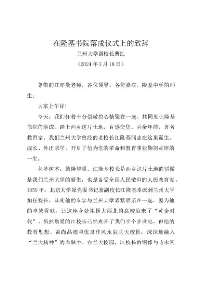 领导讲话:20240518在隆基书院落成仪式上的致辞——兰州大学副校长