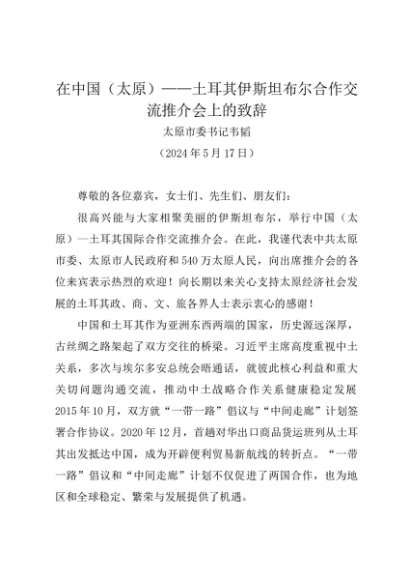 / 领导讲话:20240517在中国(太原)——土耳其伊斯坦布尔合作交流推介会上的致辞——太原市委书记韦韬