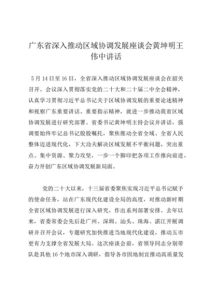 / 领导讲话:20240516广东省深入推动区域协调发展座谈会黄坤明王伟中讲话