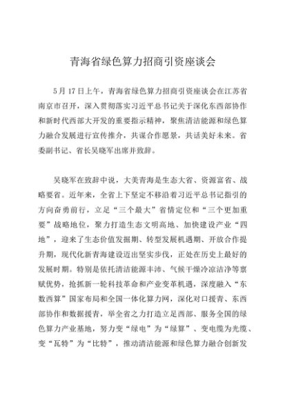 领导讲话:20240517青海省绿色算力招商引资座谈会