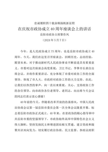 领导讲话:20240507在庆祝市政协成立40周年座谈会上的讲话——岳阳市政协主席黎作凤