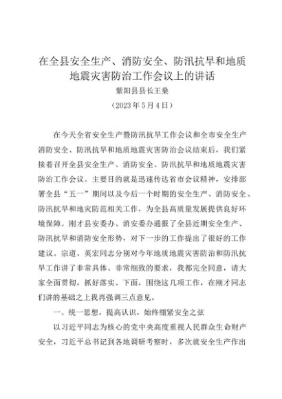 / 领导讲话:20240504在全县安全生产、消防安全、防汛抗旱和地质地震灾害防治工作会议上的讲话——紫阳县县长王燊