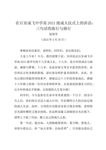 / 领导讲话:20240430在石室成飞中学高2021级成人仪式上的讲话:三句话的旅行与修行