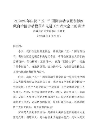 领导讲话:20240429在2024年庆祝“五一”国际劳动节暨表彰西藏自治区劳动模范和先进工作者大会上的讲话——西藏自治区党委书记 王君正(4000字)