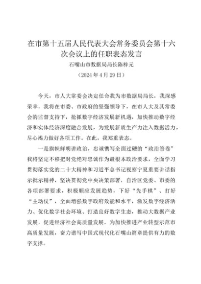 / 领导讲话:20240429在市第十五届人民代表大会常务委员会第十六次会议上的任职表态发言——石嘴山市数据局局长陈梓元
