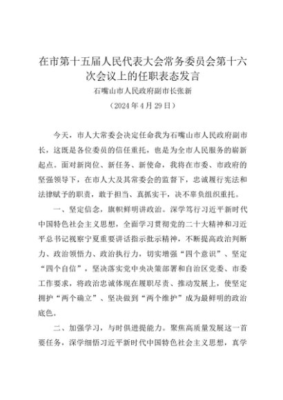 / 领导讲话:20240429在市第十五届人民代表大会常务委员会第十六次会议上的任职表态发言——石嘴山市人民政府副市长张新