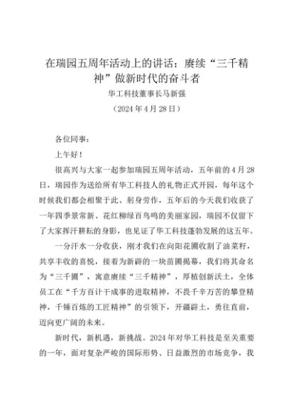 领导讲话:20240428在瑞园五周年活动上的讲话:赓续“三千精神”做新时代的奋斗者——华工科技董事长马新强
