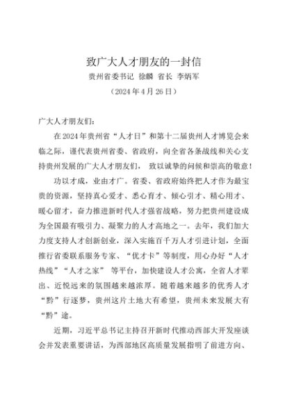 / 领导讲话:20240426致广大人才朋友的一封信——贵州省委书记徐麟、省长李炳军