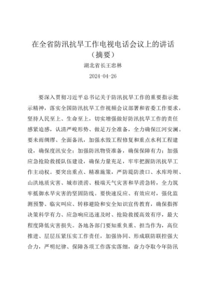 / 领导讲话:20240426在全省防汛抗旱工作电视电话会议上的讲话(摘要)——湖北省长王忠林