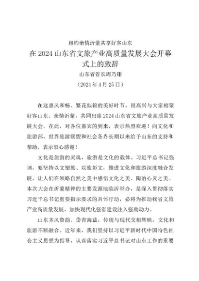/ 领导讲话:20240425在2024山东省文旅产业高质量发展大会开幕式上的致辞——山东省省长周乃翔