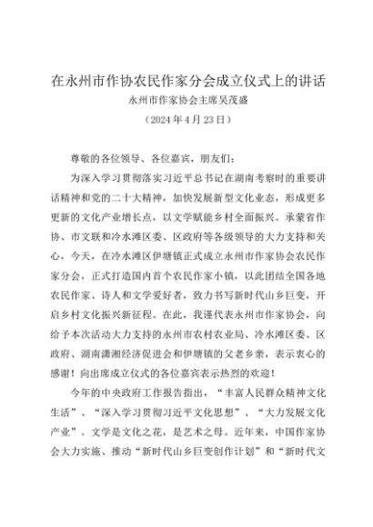 / 领导讲话:20240423在永州市作协农民作家分会成立仪式上的讲话——永州市作家协会主席吴茂盛