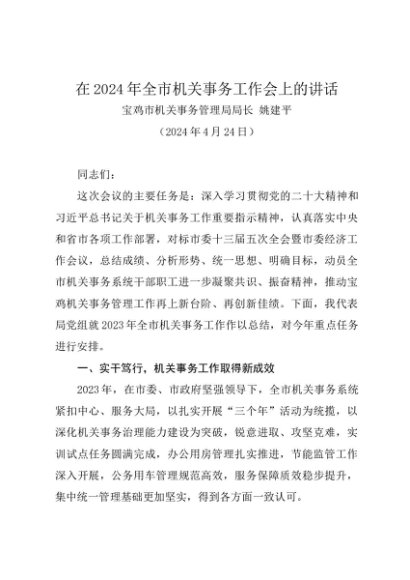 / 领导讲话:20240424在2024年全市机关事务工作会上的讲话——宝鸡市机关事务管理局局长 姚建平