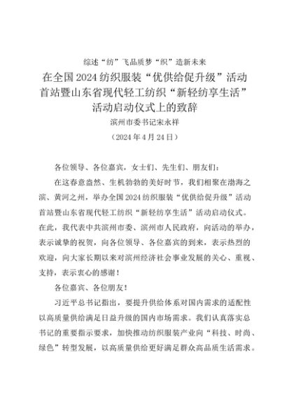 领导讲话:20240424在全国2024纺织服装“优供给促升级”活动首站暨山东省现代轻工纺织“新轻纺享生活”活动启动仪式上的致辞——滨州市委书记宋永祥