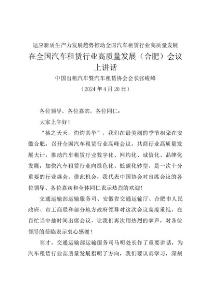 领导讲话:20240420在全国汽车租赁行业高质量发展(合肥)会议上讲话——中国出租汽车暨汽车租赁协会会长张峻峰