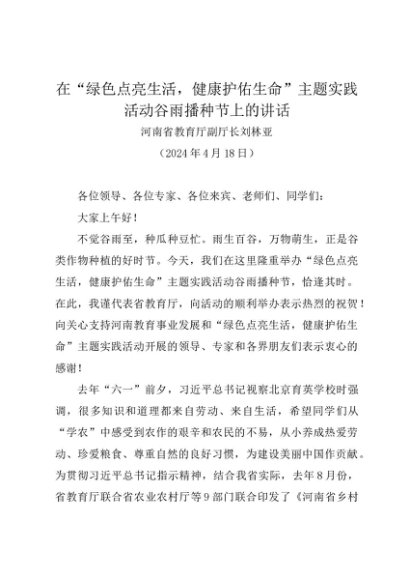 / 领导讲话:20240418在“绿色点亮生活,健康护佑生命”主题实践活动谷雨播种节上的讲话——河南省教育厅副厅长刘林亚