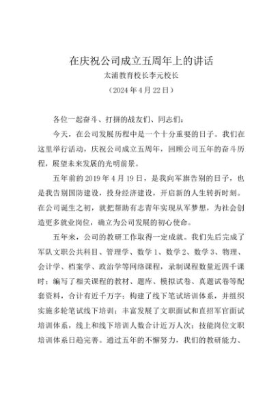 / 领导讲话:20240422在庆祝公司成立五周年上的讲话——太浦教育校长李元校长