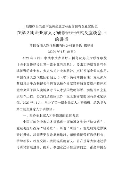 / 领导讲话:20240410在第2期企业家人才研修班开班式及座谈会上的讲话——中国石油天然气集团有限公司董事长