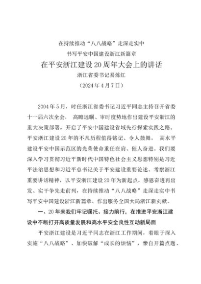 / 领导讲话:20240407在平安浙江建设20周年大会上的讲话——浙江省委书记易炼红(3600字)