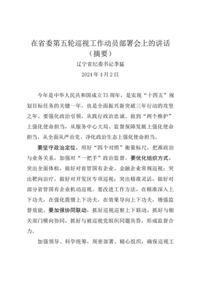 / 领导讲话:20240402在省委第五轮巡视工作动员部署会上的讲话(摘要)——辽宁省纪委书记李猛