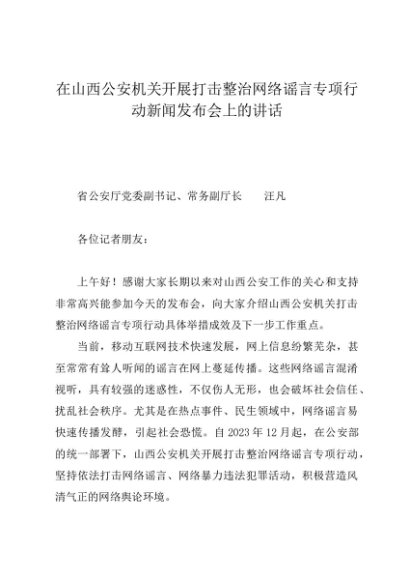 / 领导讲话:20240402在山西公安机关开展打击整治网络谣言专项行动新闻发布会上的讲话