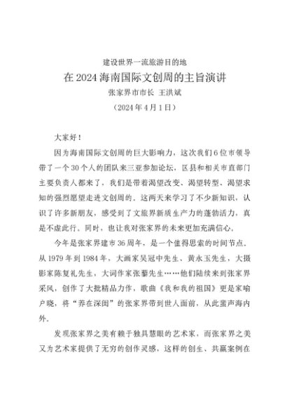 / 领导讲话:20240401在2024海南国际文创周的主旨演讲——张家界市市长 王洪斌