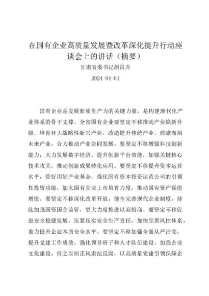 / 领导讲话:20240401在国有企业高质量发展暨改革深化提升行动座谈会上的讲话(摘要)——甘肃省委书记胡昌升