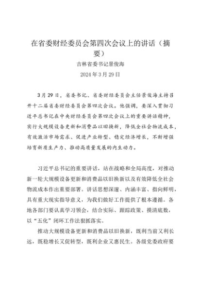 领导讲话:20240329(财经委员会)在省委财经委员会第四次会议上的讲话(摘要)——吉林省委书记景俊海