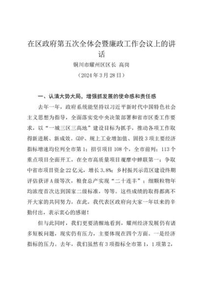 / 领导讲话:20240328在区政府第五次全体会暨廉政工作会议上的讲话——铜川市耀州区区长 高岗