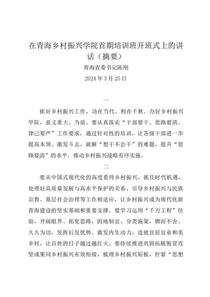 / 领导讲话:20240325在青海乡村振兴学院首期培训班开班式上的讲话(摘要)——青海省委书记陈刚: