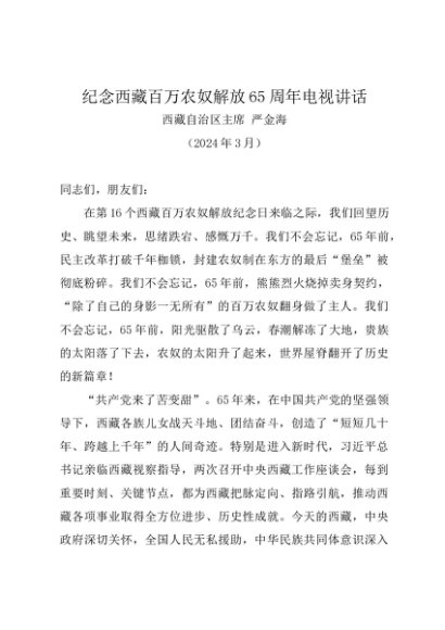 / 领导讲话:20240327纪念西藏百万农奴解放65周年电视讲话——西藏自治区主席 严金海