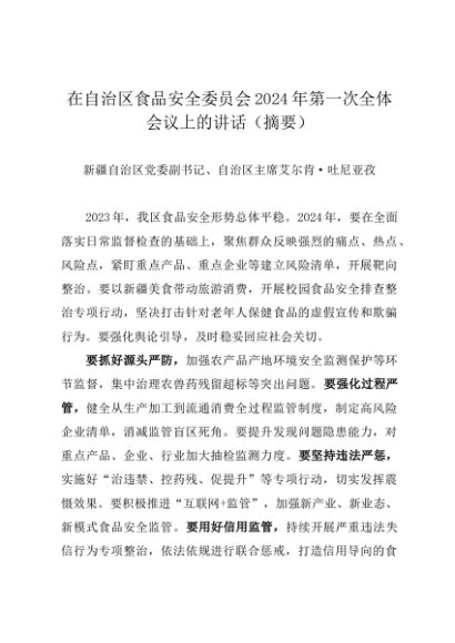 / 领导讲话:20240326(食品安全委员会)在自治区食品安全委员会2024年第一次全体会议上的讲话(摘要)