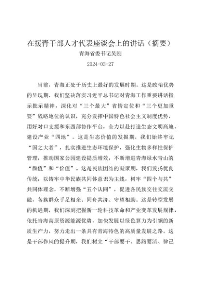 / 领导讲话:20240327(援青干部)在援青干部人才代表座谈会上的讲话(摘要)——青海省委书记吴刚