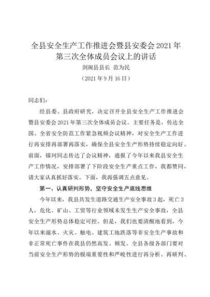 领导讲话:20240324(安全生产工作会议)全县安全生产工作推进会暨县安委会2021年第三次全体成员会议上的讲话——剑阁县县长