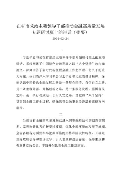 / 领导讲话:20240324在省市党政主要领导干部推动金融高质量发展专题研讨班上的讲话(摘要)