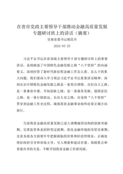 / 领导讲话:20240324在省市党政主要领导干部推动金融高质量发展专题研讨班上的讲话(摘要)——甘肃省委书记胡昌升