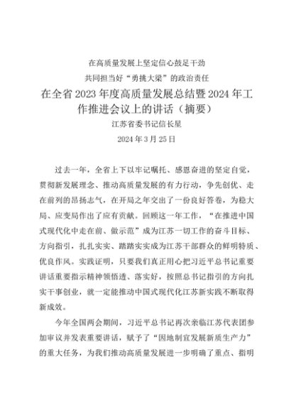 领导讲话:20240325在全省2023年度高质量发展总结暨2024年工作推进会议上的讲话(摘要)——江苏省委书记信长星