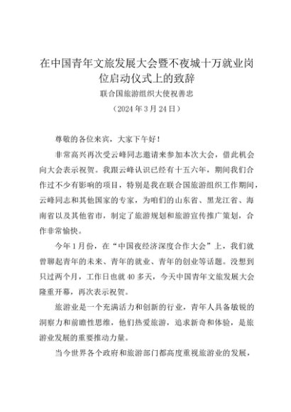 / 领导讲话:20240324在中国青年文旅发展大会暨不夜城十万就业岗位启动仪式上的致辞——联合国旅游组织大使祝善忠
