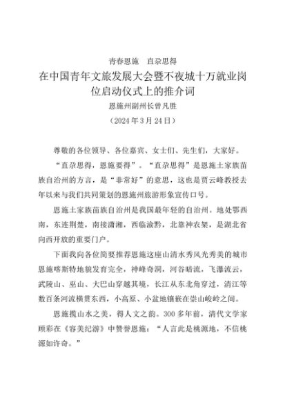/ 领导讲话:20240324在中国青年文旅发展大会暨不夜城十万就业岗位启动仪式上的推介词——恩施州副州长曾凡胜